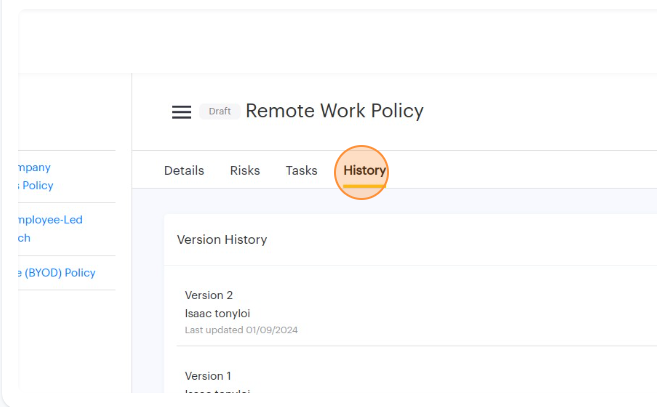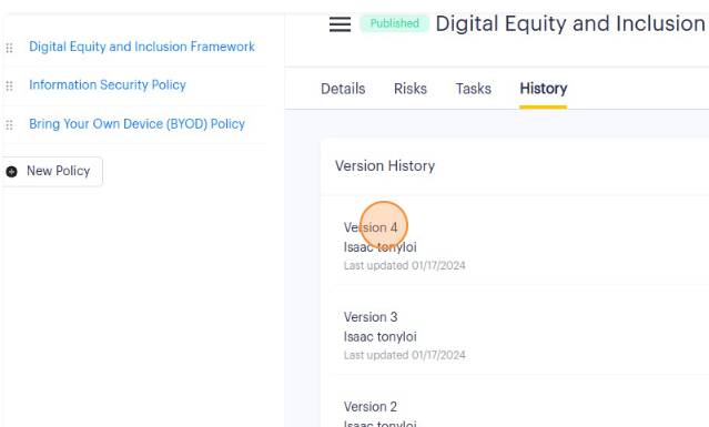 3. Click on the History tab to retrieve the historical published versions of that specific policy.