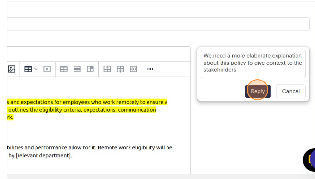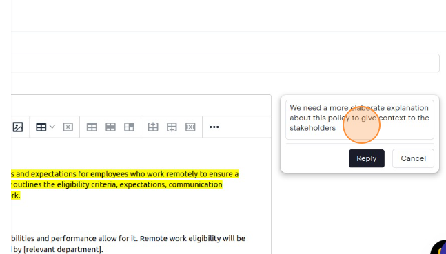 6. Within the comment text field, you can type your comment and when you're ready, click the "Reply" button to attach your comment to the highlighted section of the policy description. Please note that all policy editors (Admin role and Trusted role users) will receive a notification email regarding the comment left in the policy.