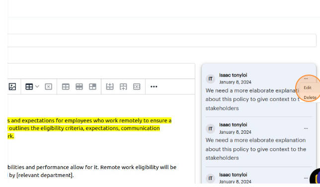 9. From the dropdown menu, select the appropriate action. Choose the "Edit" option to make revisions to the comment text and save your changes. Choose the "Delete" option to remove the comment entirely.
