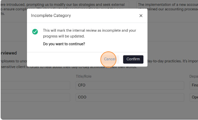 17. The "Cancel" button will close the pop up window without marking the internal review as complete.