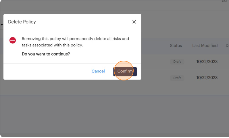 4. Delete functions always open a confirmation pop-up to allow you the opportunity to change your mind. You must click the "Confirm" button to affirm your intent to delete the policy.