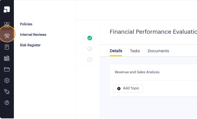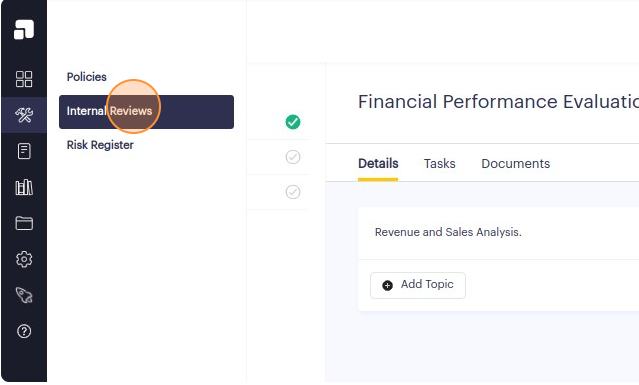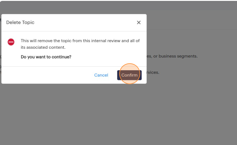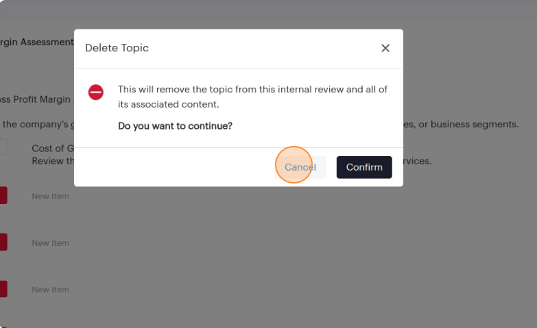 Please note that deleting a topic from an internal review will also delete its associated content such as items, log findings, and log notes.