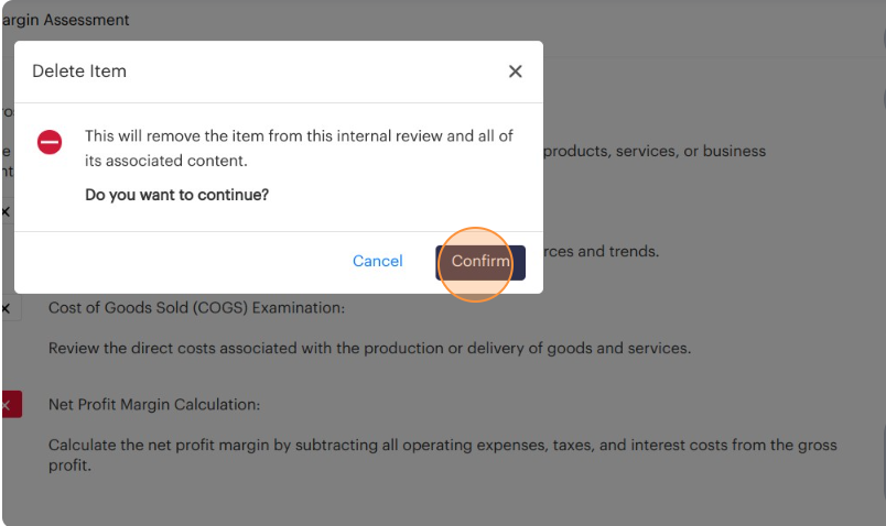 Please note that deleting an item from an internal review will also delete its associated content such as log findings, and log notes.
