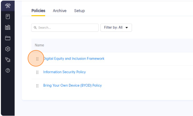2. Policies can be reordered from the default Policies tab or within the left hand policy tree from within a Policy Details page. From either location, you press on the "Drag-and-Drop" icon that looks like two columns of three dots of the policy that you want to reorder. This action "grabs" the policy, allowing you to move it as long as you have not released the selection, i.e. this is not a click and release action, but a select and hold action.