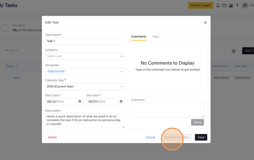 - Once Edit Task pop-up is open, you can click the "Mark as Complete" button to mark the task as complete.